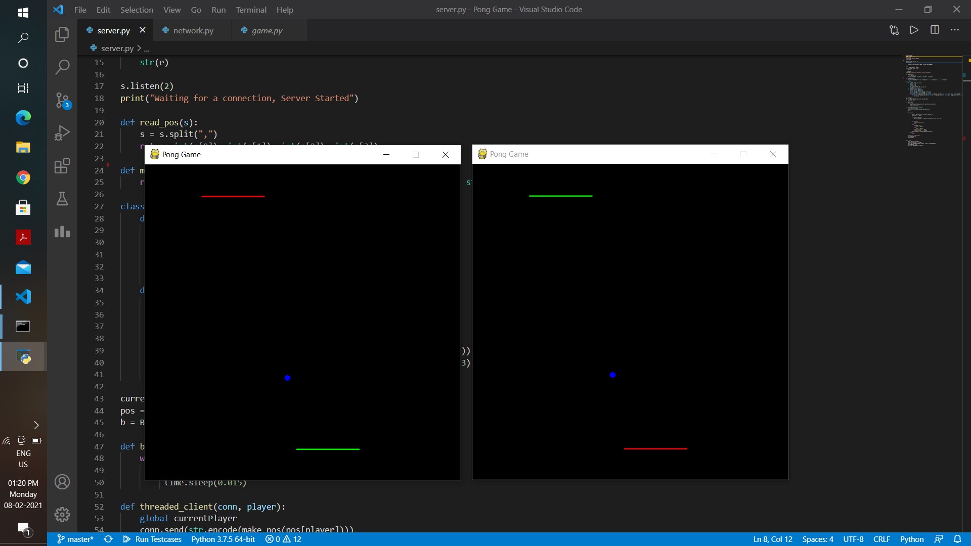 I made this game while learning socket programming in Python. Here any two clients can join through a server to play the Pong Game. The screenshot shows two clients connected to the port where server was running in order to play the game.